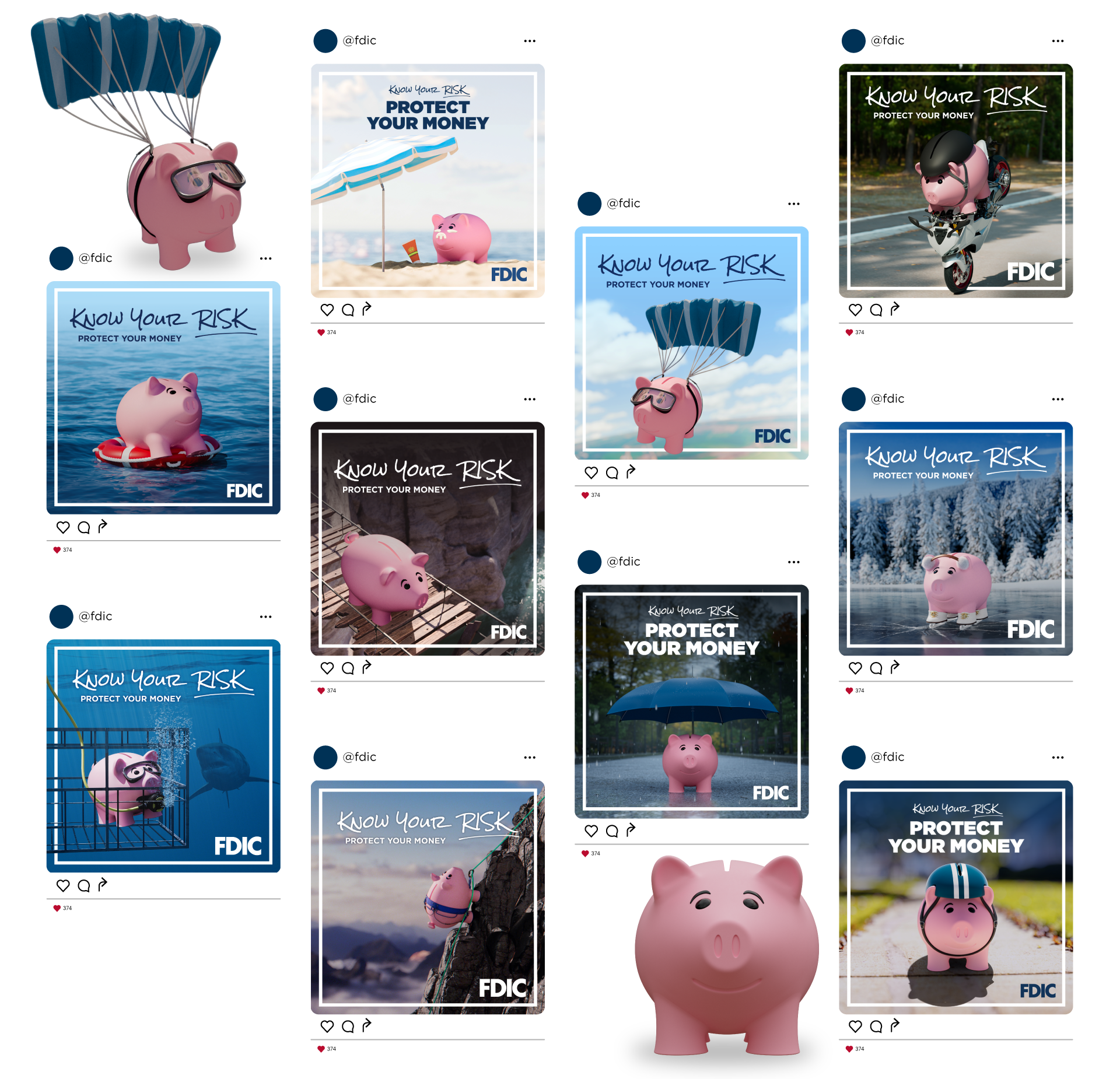 Our team was tasked with creating a campaign that educated Gen Z on the importance of having their money in an FDIC insured bank. We took a universal and adorable symbol for savings and put it in precarious situations showing how their money might be in accounts and products that are not insured. We worked with a 3D studio to create an own-able character and scenarios. Using the 3D assets I created a holistic set of assets.